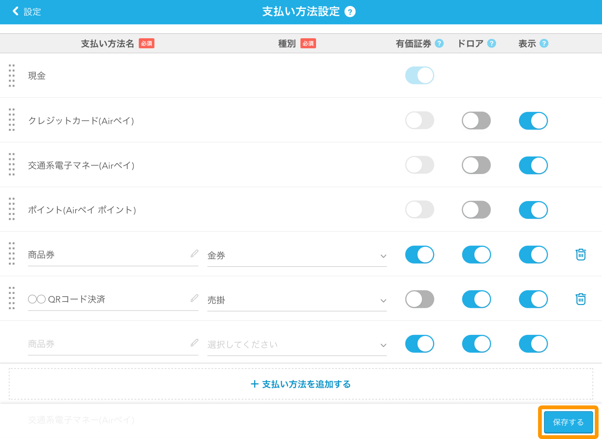 「支払い方法設定」画面で、店舗独自の支払い方法を追加して設定できます。また、支払い方法の並び順を変更したり、不要な支払い方法の削除もできます。
