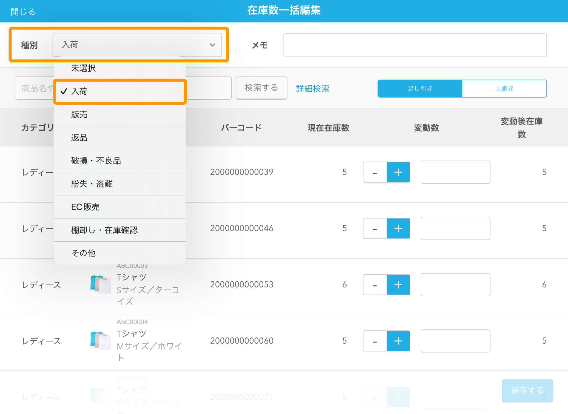 「入荷」や「返品」などの種別を選択することで、在庫の変動理由を区別して残せます。