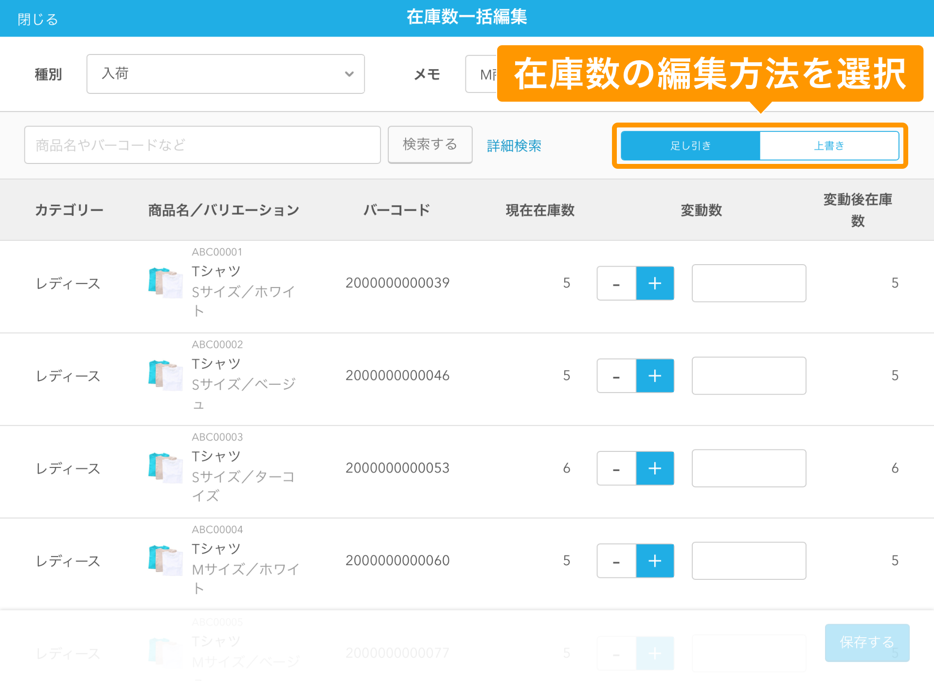現在の在庫数との差分を入力できます。現在の在庫に入荷分の数量を追加する場合などに利用できます。
