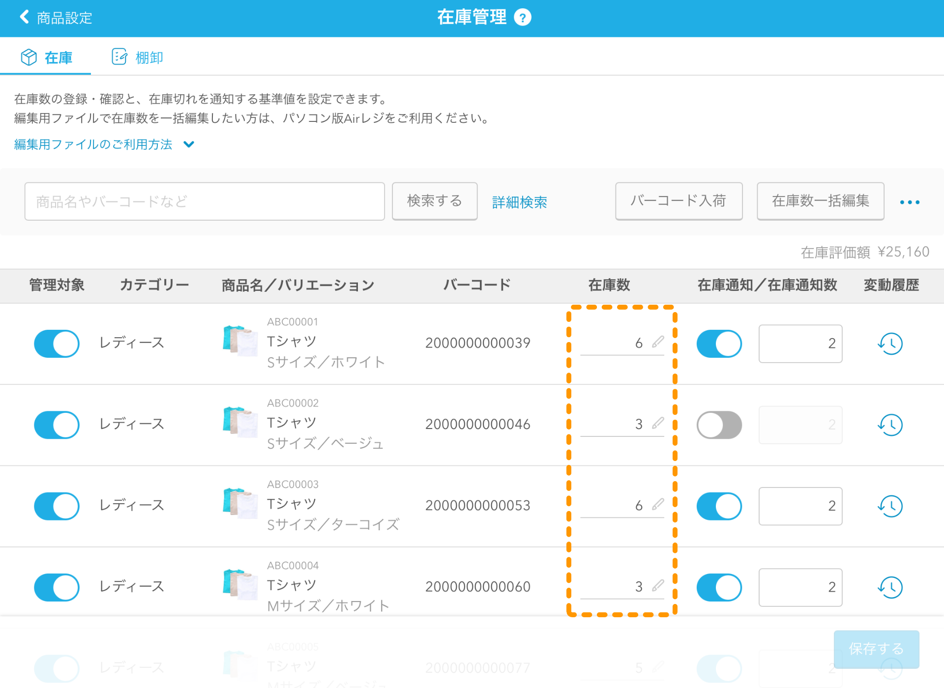 「在庫管理」画面が開き、在庫数の編集ができます。