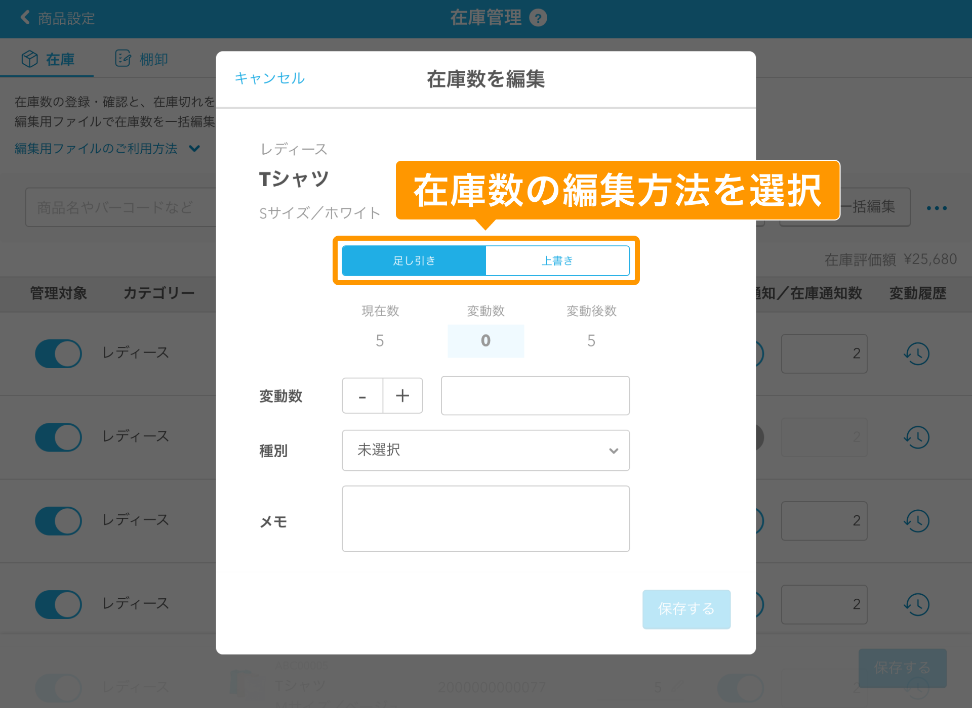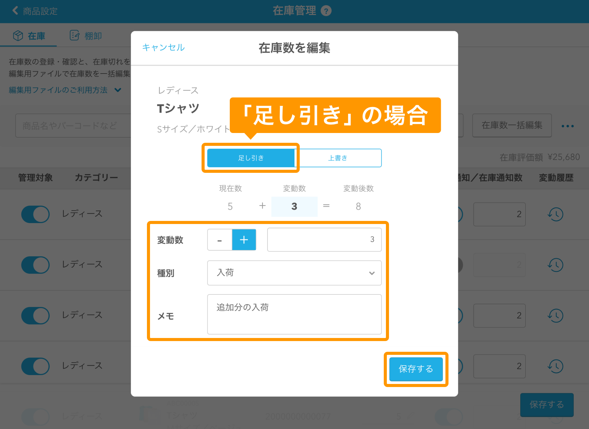 「足し引き」が選択された状態で、「現在在庫数」との差分を「変動数」に入力します。