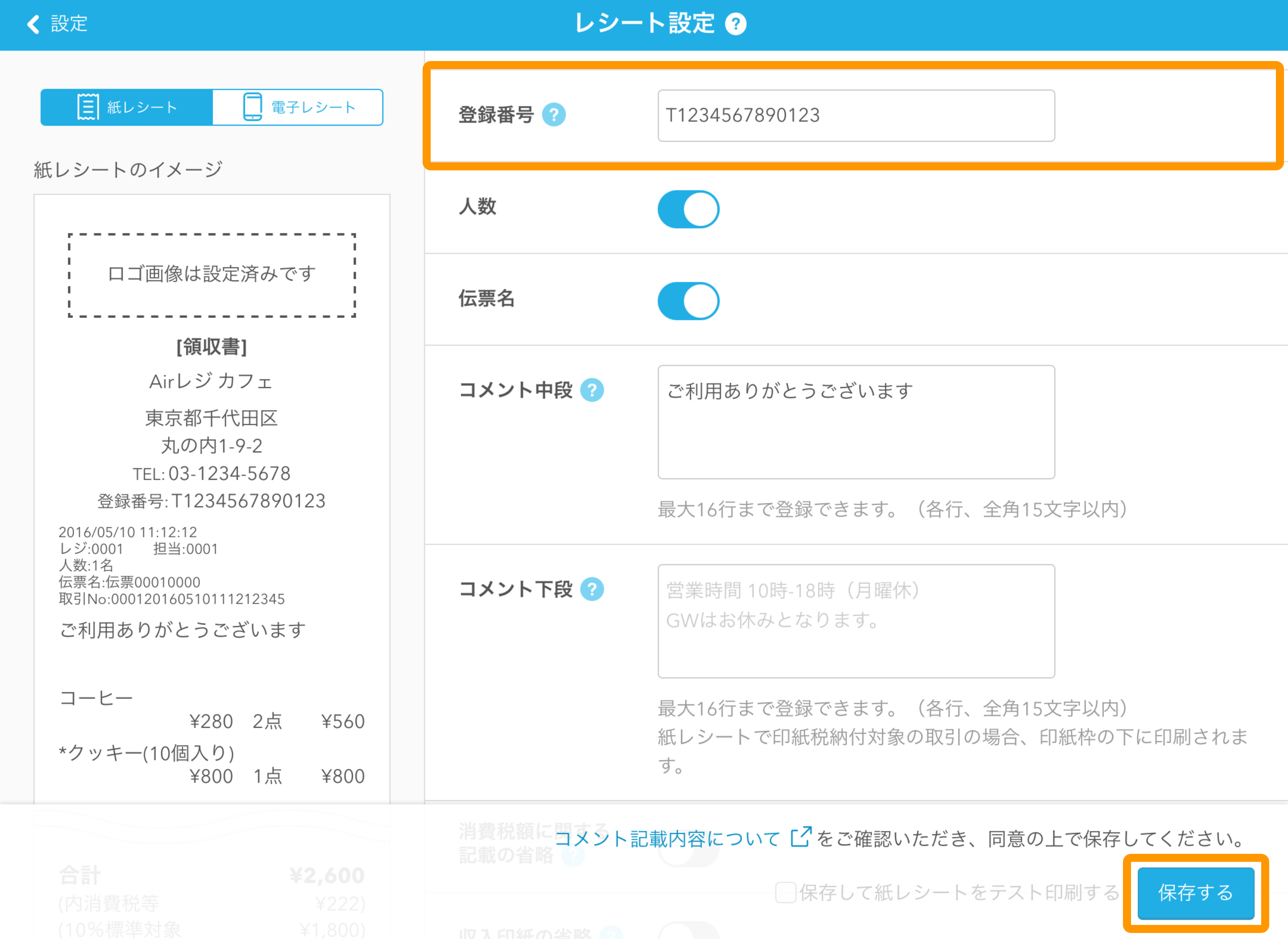 - 入力した「店舗名」は、電子レシート/紙レシートに記載されます。